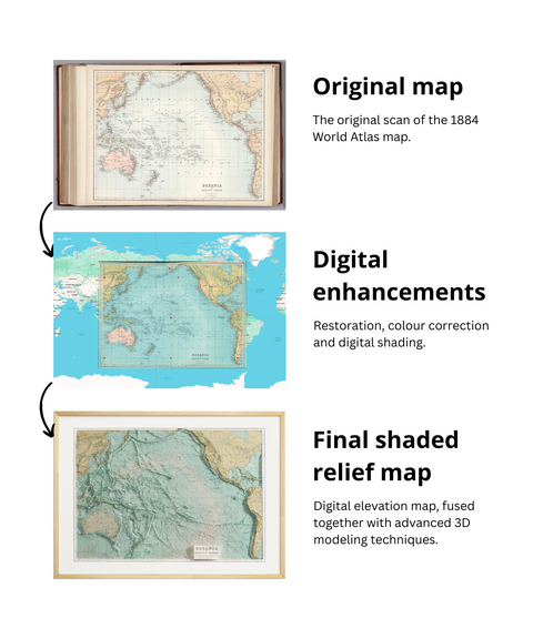 Bring home this stunning reproduction of an 1884 map of Oceania and the Pacific Ocean, enhanced with digital shading and satellite elevation data. This fusion of historical cartography and modern technology creates a breathtaking interplay of light and shadow, making the landscape appear almost three-dimensional.