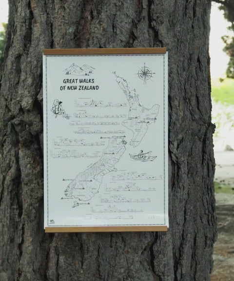 This unique handcrafted poster map shows all 11 Great Walks of New Zealand, including the new Hump Ridge Track, with their elevation profiles and detailed route descriptions. Great walks are accurately placed on the map and marked in golden colour. As you visit each great walk, scratch the mountain to mark your progress.
